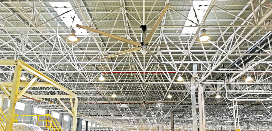 一般來說,暖通空調系統或其他采暖設備,往往會出現循環不穩定的情況。由于常見的障礙物或通風口位置不佳,暖氣流可能會停滯和向屋頂區域聚集。往往屋頂上空的溫度可能比地板上高出十幾度。HVLS 風扇可以幫助將熱空氣向下拉過葉片,形成一柱熱空氣,當它與地板接觸時向外擴散。然而,更有效的方法是以反向模式運行工業大風扇,反向模式將暖空氣向上和向外推動,迫使其沿著建筑物墻壁向下分布并均勻地分布在地板上。無論哪種方式,