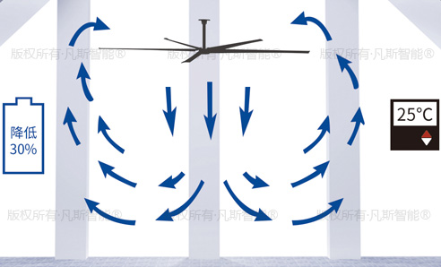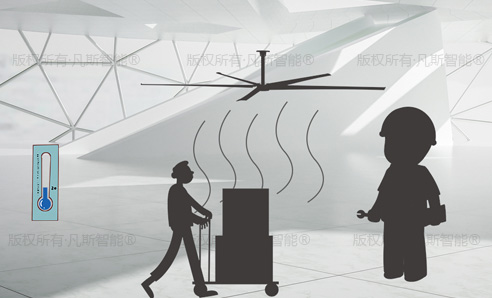 冬季采暖設備的暖空氣上升停留在屋頂,地面依然寒冷,溫度分層。大型吊扇可將屋頂的高溫氣流與下層低溫氣流攪動均衡,提高制暖率。