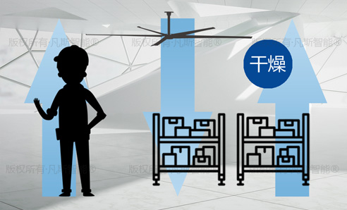 雨季空氣濕度大,設銹蝕、產品受潮、滋生細菌。凡斯大型工業吊扇加速空氣流動,快速吹散濕氣,保持室內干爽、貨物產品干燥。